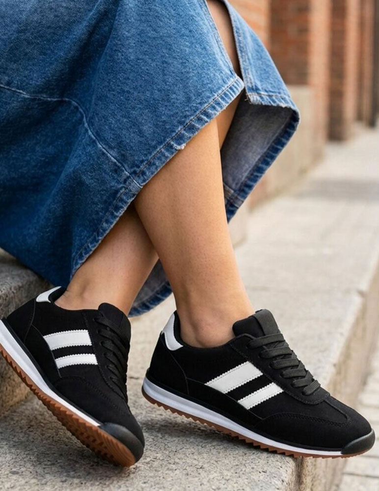 Čierne tenisky Romilly majú jednoduchý a nadčasový dizajn, ktorý je ideálny na každodenné nosenie. Sú vyrobené z jemného ekosemišu, ktorý pôsobí mäkko a štýlovo. Boky topánok zdobia dva kontrastné pásiky z ekokože, ktoré dodávajú celkovému vzhľadu športovo-elegantný charakter. Šnurovanie umožňuje dobré prispôsobenie nohe, zatiaľ čo pohodlná stielka a pružná podrážka zabezpečujú komfort pri chôdzi.