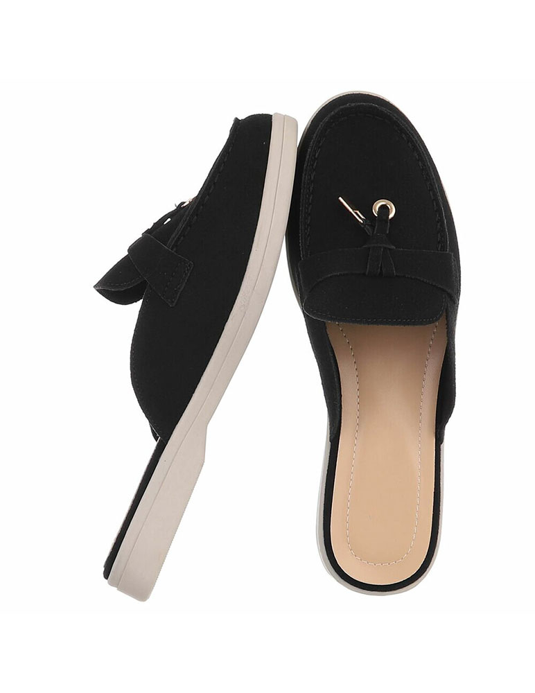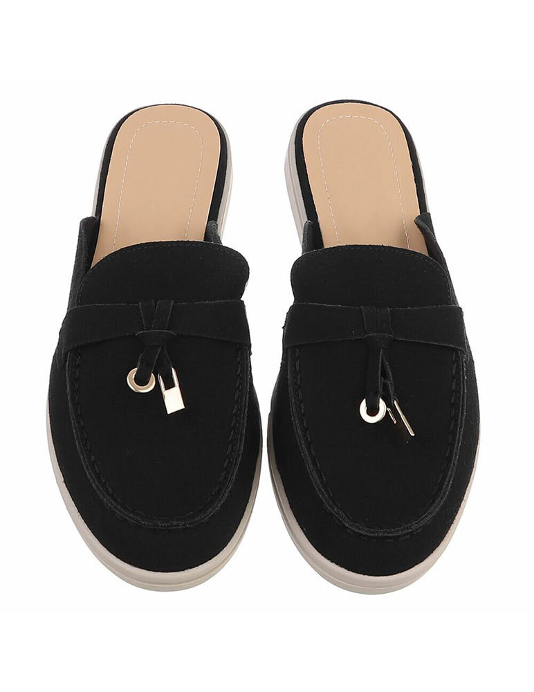 Čierne šľapky Eugenie sú vyrobené z jemného ekosemišu, ktorý pôsobí mäkko a elegantne. Majú uzavretú, plnú špičku, ktorá dodáva obuvi upravený a štýlový vzhľad. Dizajn je čistý a nadčasový, vhodný na každodenné nosenie aj menej formálne príležitosti. Vnútorná stielka je pohodlná a prispôsobená chodidlu.