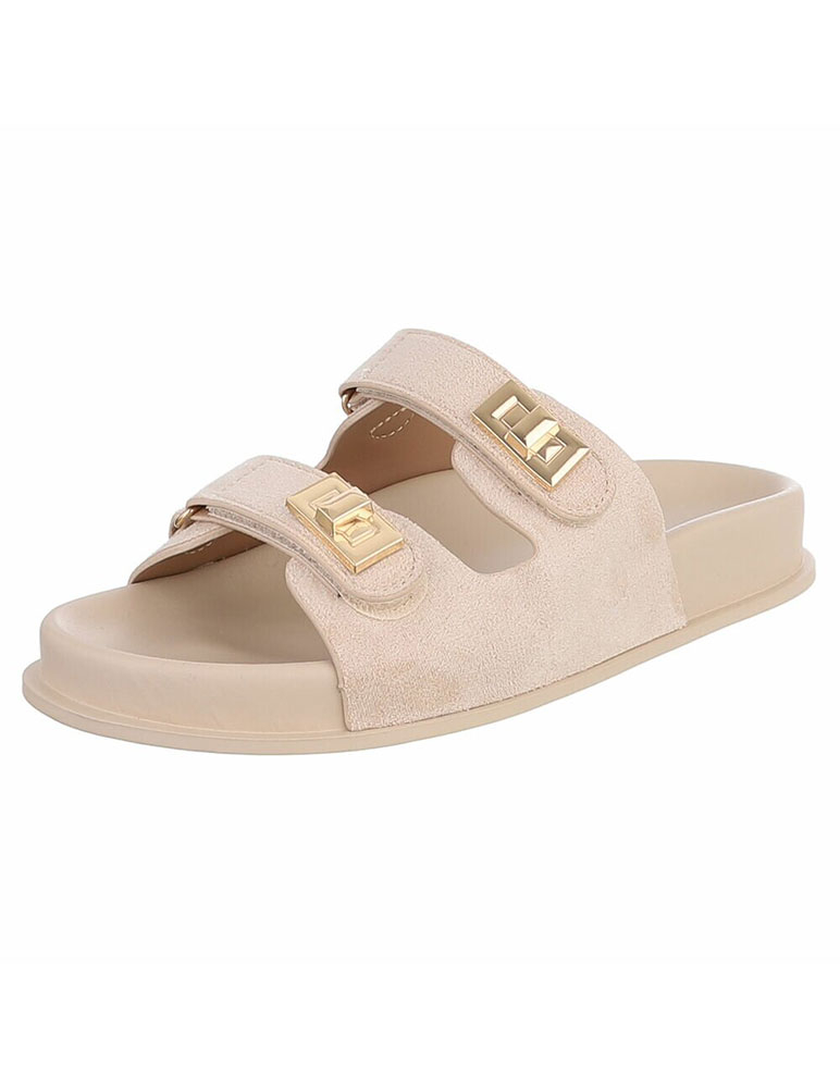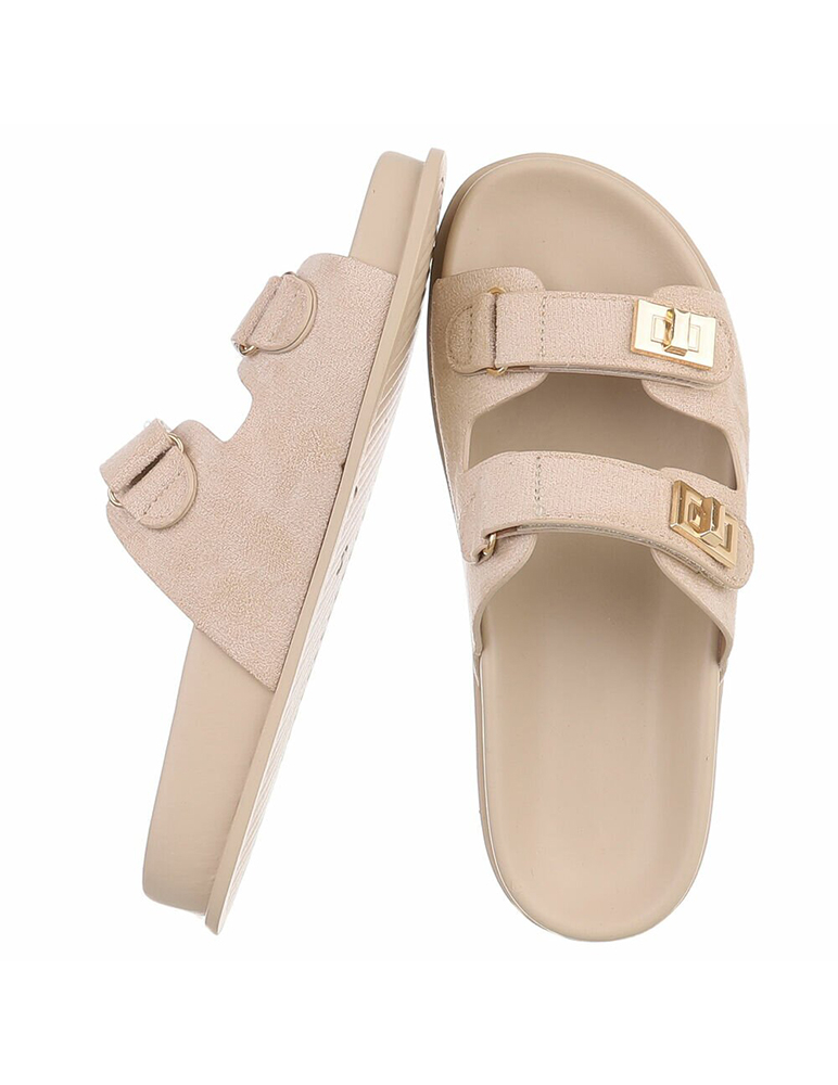 Béžové šľapky Araminta sú vyrobené z ekosemišového materiálu, ktorý pôsobí jemne a zamatovo na dotyk. Majú otvorený dizajn s dvoma širokými remienkami cez priehlavok, ktoré zabezpečujú stabilitu a pohodlné nosenie. Každý remienok je doplnený výraznou zlatou sponou, ktorá zároveň dodáva obuvi štýlový, moderný vzhľad. Vnútorná stielka je tvarovaná pre väčší komfort pri chôdzi.