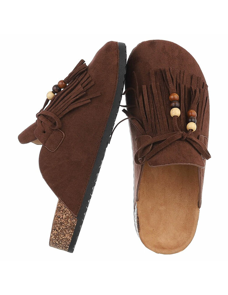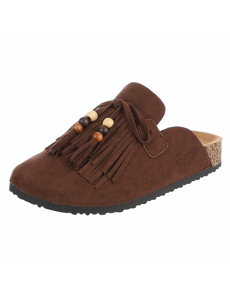 Dámske hnedé šľapky Lumi majú jemný, elegantný vzhľad. Zvršok je vyrobený z mäkkého, ekosemišového materiálu. Prednú časť zdobia výrazné strapce doplnené malými korálkami v prírodných odtieňoch, ktoré vytvárajú zaujímavý bohémsky detail. Šľapky majú otvorenú pätu a pohodlnú tvarovanú stielku, ktorá pôsobí komfortne pri nosení.
