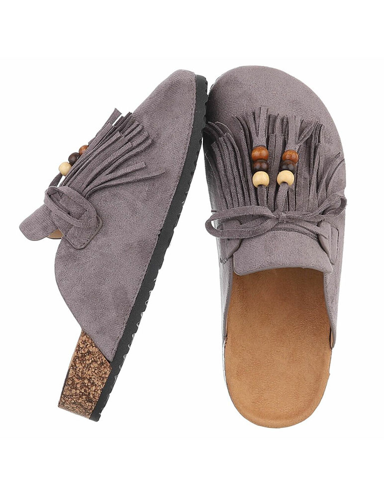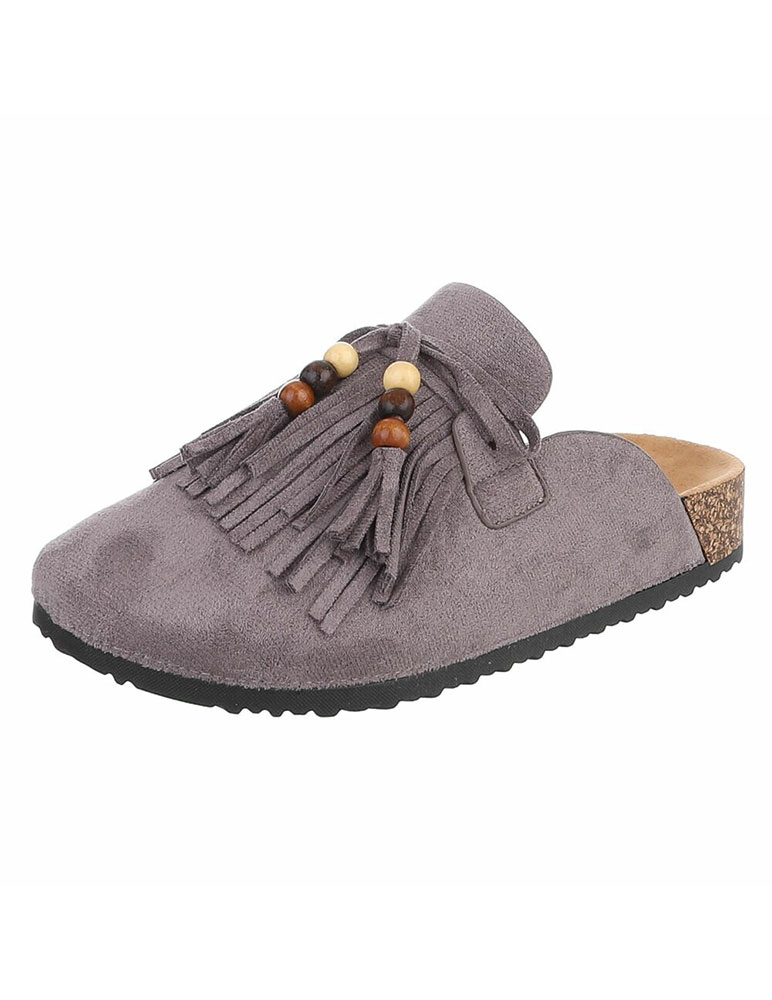 Dámske sivé šľapky Lumi majú jemný, elegantný vzhľad. Zvršok je vyrobený z mäkkého, ekosemišového materiálu. Prednú časť zdobia výrazné strapce doplnené malými korálkami v prírodných odtieňoch, ktoré vytvárajú zaujímavý bohémsky detail. Šľapky majú otvorenú pätu a pohodlnú tvarovanú stielku, ktorá pôsobí komfortne pri nosení.