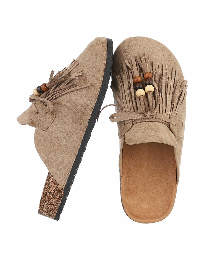 Dámske khaki šľapky Lumi majú jemný, elegantný vzhľad. Zvršok je vyrobený z mäkkého, ekosemišového materiálu. Prednú časť zdobia výrazné strapce doplnené malými korálkami v prírodných odtieňoch, ktoré vytvárajú zaujímavý bohémsky detail. Šľapky majú otvorenú pätu a pohodlnú tvarovanú stielku, ktorá pôsobí komfortne pri nosení.