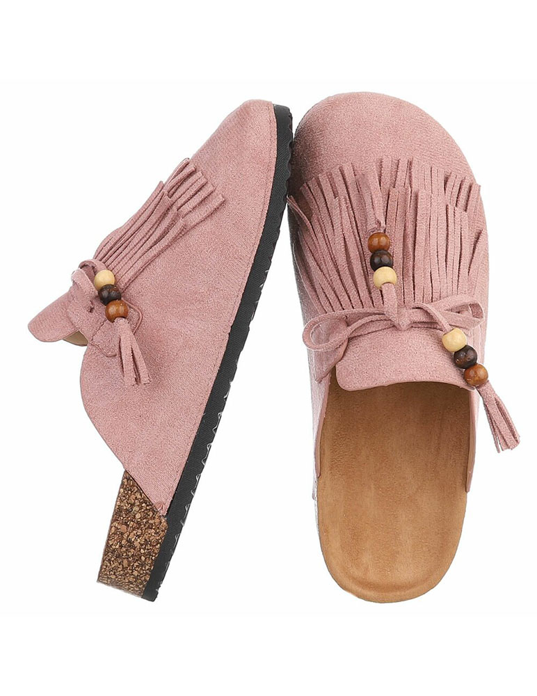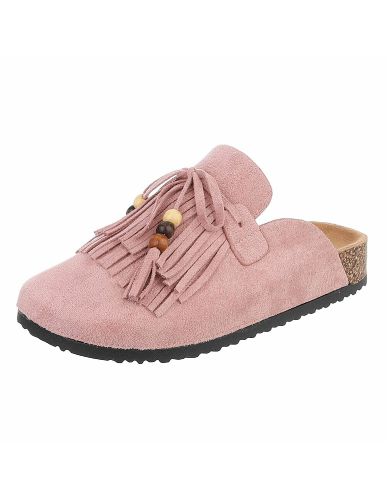 Dámske ružové šľapky Lumi majú jemný, elegantný vzhľad. Zvršok je vyrobený z mäkkého, ekosemišového materiálu. Prednú časť zdobia výrazné strapce doplnené malými korálkami v prírodných odtieňoch, ktoré vytvárajú zaujímavý bohémsky detail. Šľapky majú otvorenú pätu a pohodlnú tvarovanú stielku, ktorá pôsobí komfortne pri nosení.