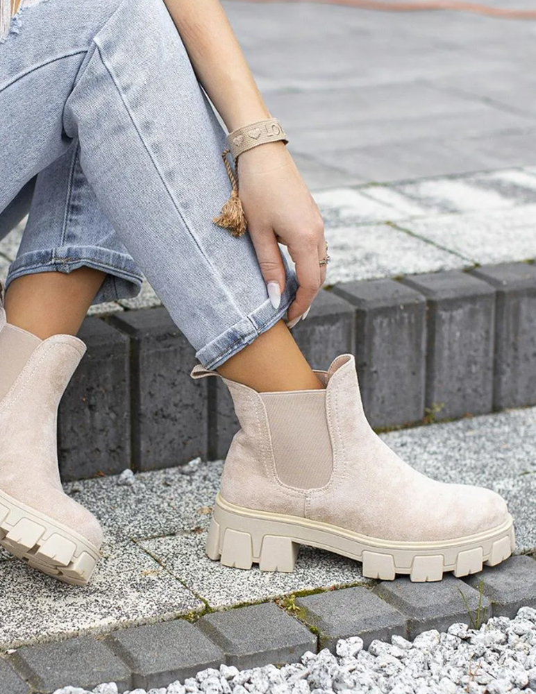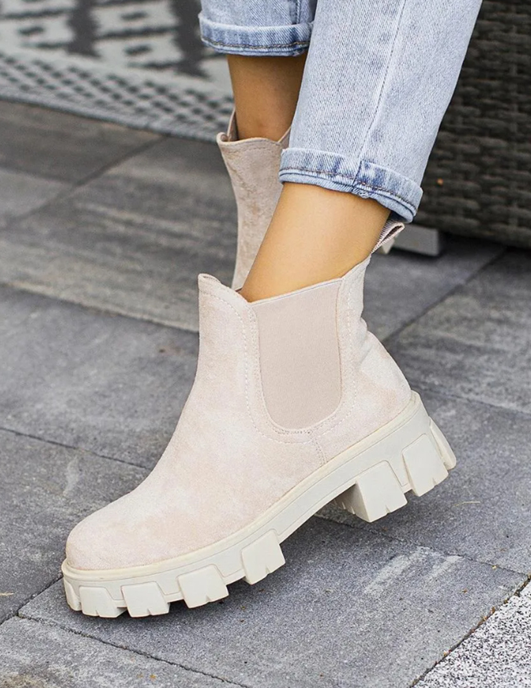 Béžové členkové čižmy Cate sú klasické semišové členkové čižmy na hrubšej podrážke. Po bokoch sáry majú gumičky pre ľahšie obúvanie. Perfektne sa hodia pre jesenné outfity.