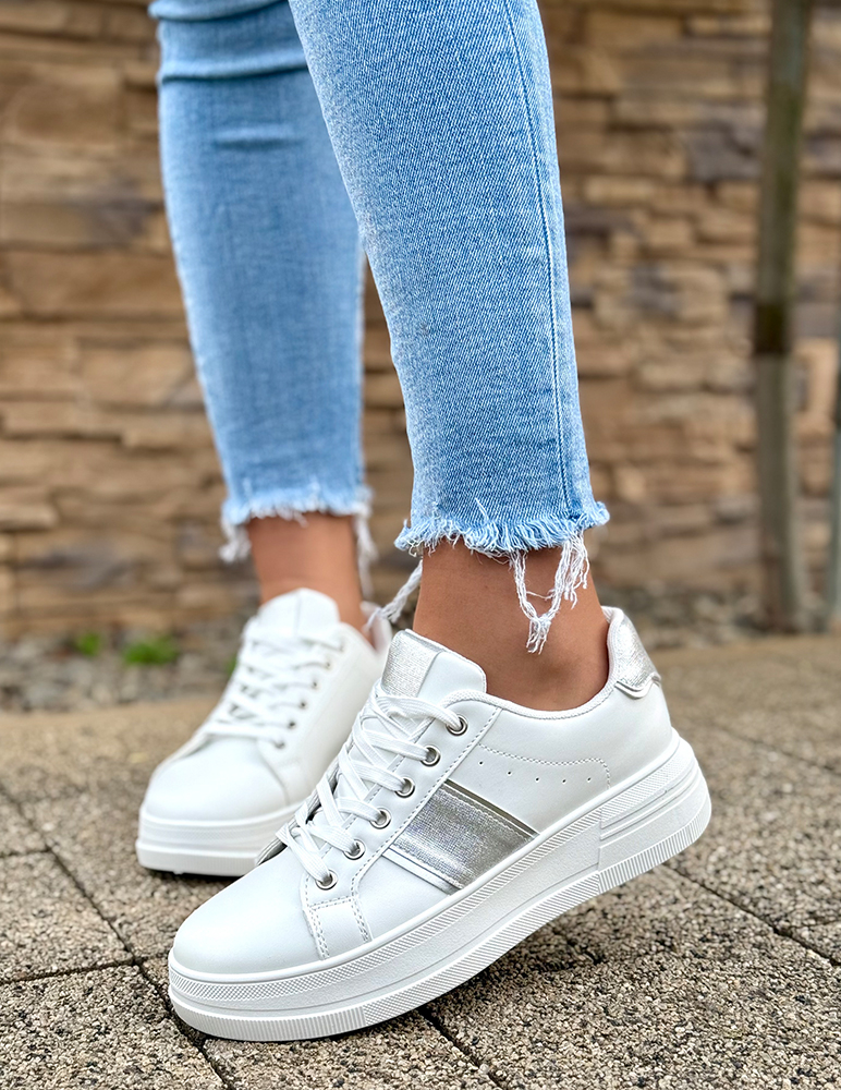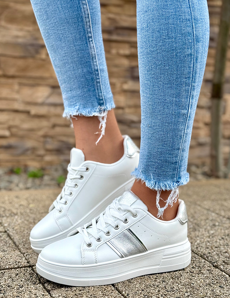 Strieborné tenisky Josie sú klasické tenisky na rovnej vyvýšenej podrážke. Zvršok majú z ekokože, ľahko sa kombinujú a sú pohodlné.